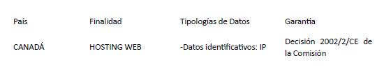 En cumplimiento de lo establecido en el Reglamento Europeo 2016/679 del Parlamento Europeo y del Consejo de 27 de abril de 2016, y la Ley Orgánica 3/2018, de 5 de diciembre, de Protección de Datos Personales y garantía de los derechos digitales, te informamos que, como consecuencia de los proveedores empleados, la entidad realiza las siguientes transferencias internacionales de datos a destinatarios establecidos fuera del Espacio Económico Europeo (EEE):