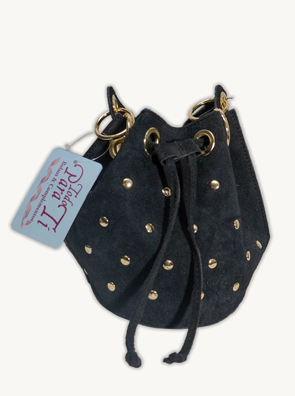 Nuestro bolso bombonera está confeccionado en suave tela de antelina de alta calidad, un material con un tacto agradable y un acabado premium que lo hace destacar. El diseño se realza con tachuelas doradas distribuidas estratégicamente, aportando un aire rock y moderno. Su forma icónica de saco o bombonera se cierra mediante un cordón ajustable de antelina, asegurando tus pertenencias con estilo. Además, incorpora detalles metálicos dorados en los ojales y un asa o cadena para llevarlo al hombro o cruzado. Es el complemento ideal tanto para un look casual como para una salida nocturna.