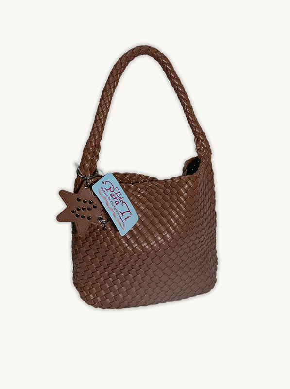 Este diseño sofisticado destaca por su acabado metálico y la textura artesanal de su trenzado. Incluye un asa de hombro cómoda y el llamativo detalle de estrella decorativo, ofreciendo una versatilidad única. Disponible en tonos gris plomo y marrón, es el accesorio ideal para cualquier ocasión.
