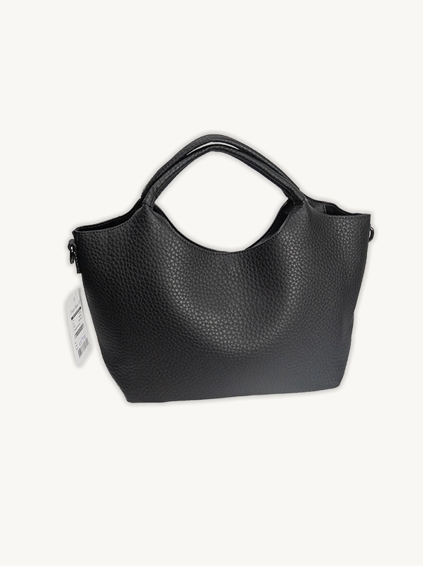 Sus funcionalidades incluyen doble asa de mano reforzada, ideal para un agarre cómodo y rápido, y un asa larga desmontable y ajustable que te permite llevarlo al hombro o cruzado (estilo bandolera), ofreciendo máxima libertad. La apertura superior es amplia para facilitar el acceso, y los detalles metálicos discretos refuerzan su diseño atemporal. Es el equilibrio perfecto entre bolso moderno y clásico. Añade este toque de sofisticación a tu colección y siente la confianza que te da un accesorio impecable. Bolso de mano negro para mujer.